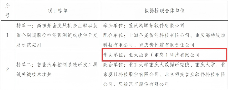 近日,重慶市經(jīng)濟(jì)和信息化委員會公示了工業(yè)和信息化領(lǐng)域“揭榜掛帥”項目榜單(工業(yè)軟件鏈?zhǔn)焦リP(guān)方向第一批)揭榜單位名單。北太振寰(重慶)科技有限公司(簡稱北太振寰)作為牽頭單位參與的“智能汽車控制系統(tǒng)研發(fā)工具鏈關(guān)鍵技術(shù)攻關(guān)”項目成功上榜。